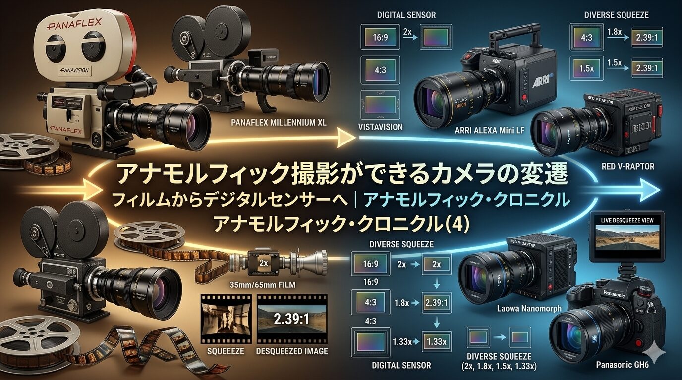 アナモルフィックレンズの歴史を語るとき、レンズだけを見ていては全体像は掴めない。レンズはカメラに装着されて初めて映像を記録する。そしてカメラの技術的制約——フィルムフォーマット、センサーサイズ、アスペクト比、デスクイーズ対応——が、アナモルフィック撮影の可能性と限界を規定してきた。