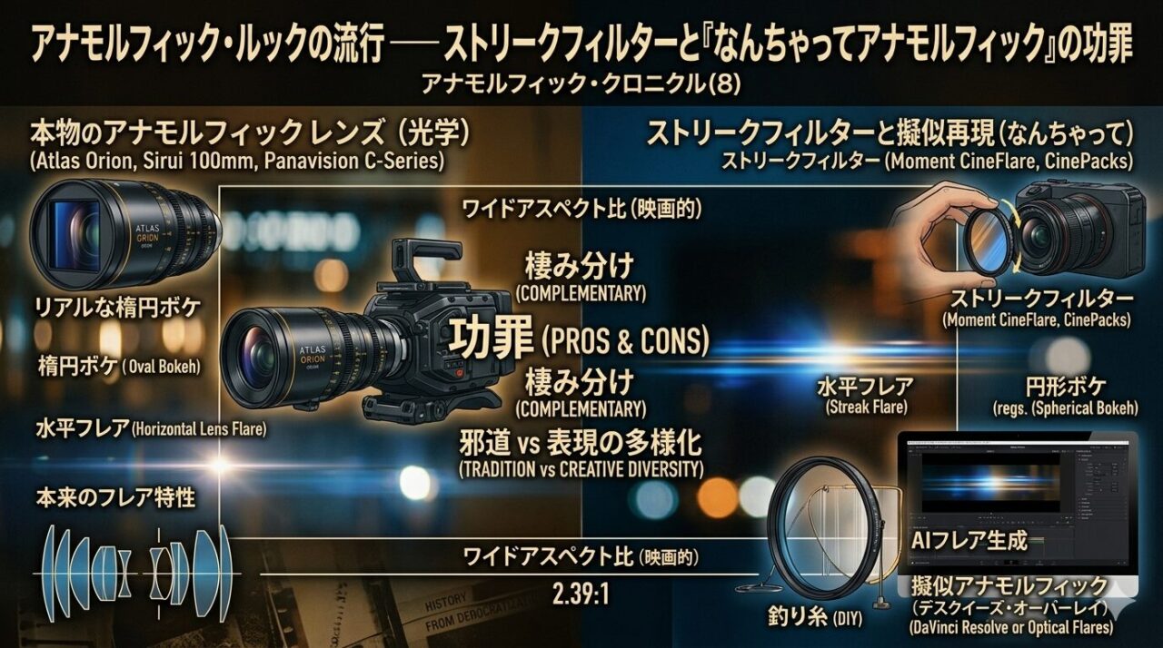 ストリークフィルターは「アナモルフィック・ルックの一部分を極めて安価に手に入れる手段」であり、本物のアナモルフィックレンズの代替ではない。しかし、映像表現の民主化という文脈では、ストリークフィルターもまた「アナモルフィック的表現へのアクセスを広げた」ツールとして正当に位置づけられる。