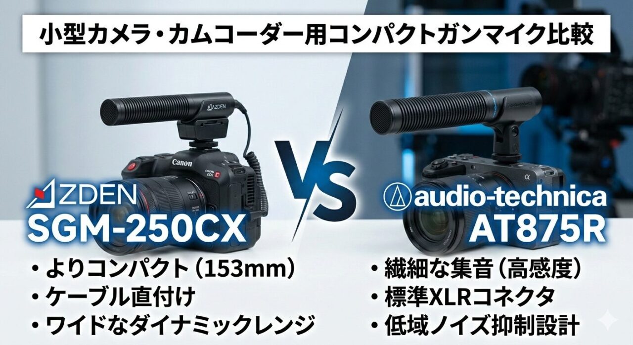 今回取り上げるのは、アツデン SGM-250CX(および派生モデルのSGM-250MX・SGM-250LX)とオーディオテクニカ AT875R。どちらも全長わずか約15〜17.5cmという小型サイズで、Sony FX3、Canon C50、Blackmagic PYXIS 6K(Mini-XLR接続)といった小型シネマカメラや、Canon XF605、Panasonic AG-CX370、Sony Z200などの小型〜中型カムコーダーとの相性が抜群に良い。