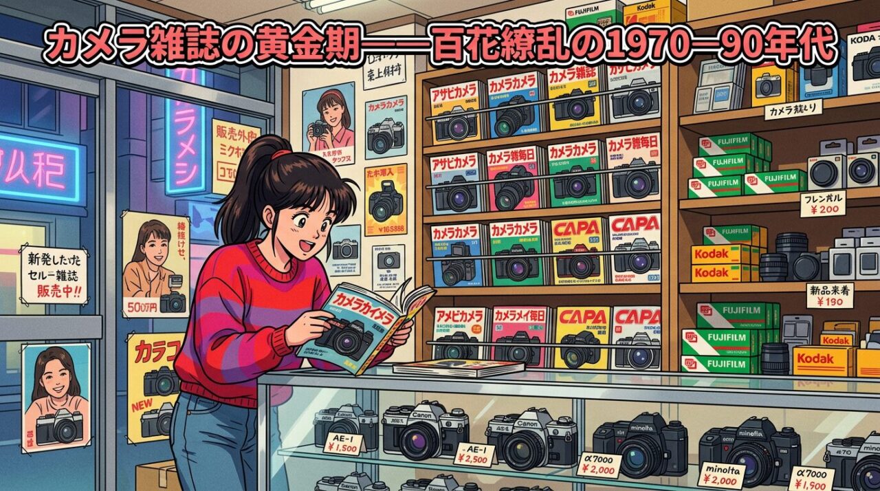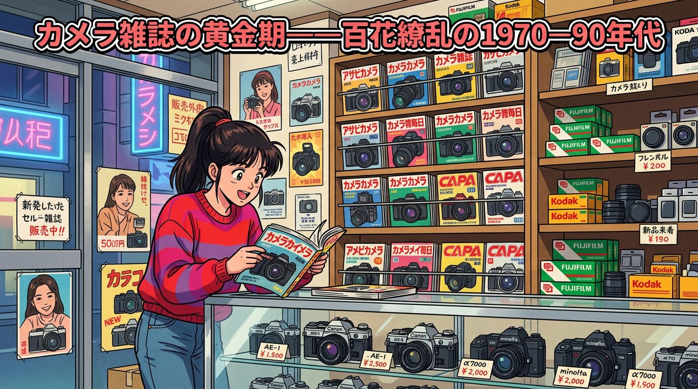 191970年代後半から1990年代にかけて、日本のカメラ雑誌は黄金期を迎える。AF一眼レフの登場、フィルムの多様化、コンパクトカメラの爆発的普及——カメラ市場の拡大とともに、カメラ雑誌も読者数・広告収入ともにピークに達した。この時期に創刊された雑誌のいくつかは、2026年の現在も刊行が続いている。本章では、カメラ雑誌が百花繚乱の様相を呈した黄金期を描く。