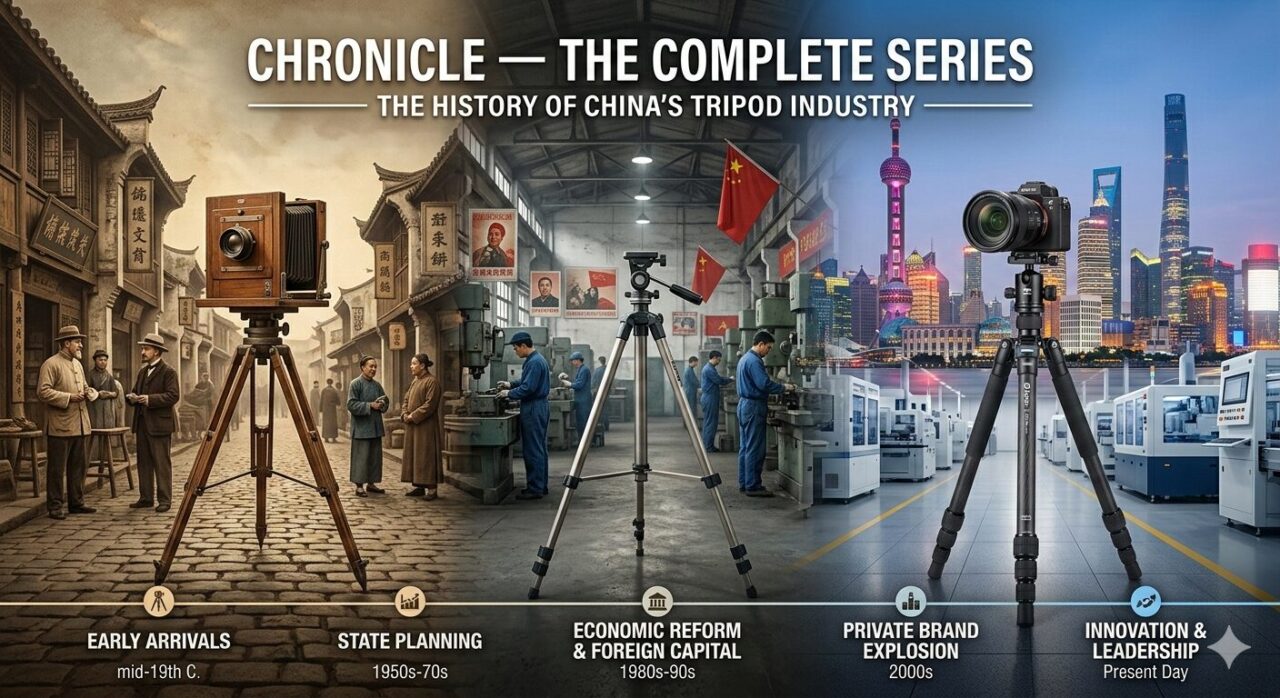 20世紀初頭、中国にカメラが持ち込まれた時代から、国有工場が計画経済のもとで光学機器を製造した時代、改革開放による外資導入とOEM受注の幕開け、そして2000年代以降の民間ブランドの勃興と世界市場への進出——中国の三脚産業は、中国近現代史そのものと深く結びついている。