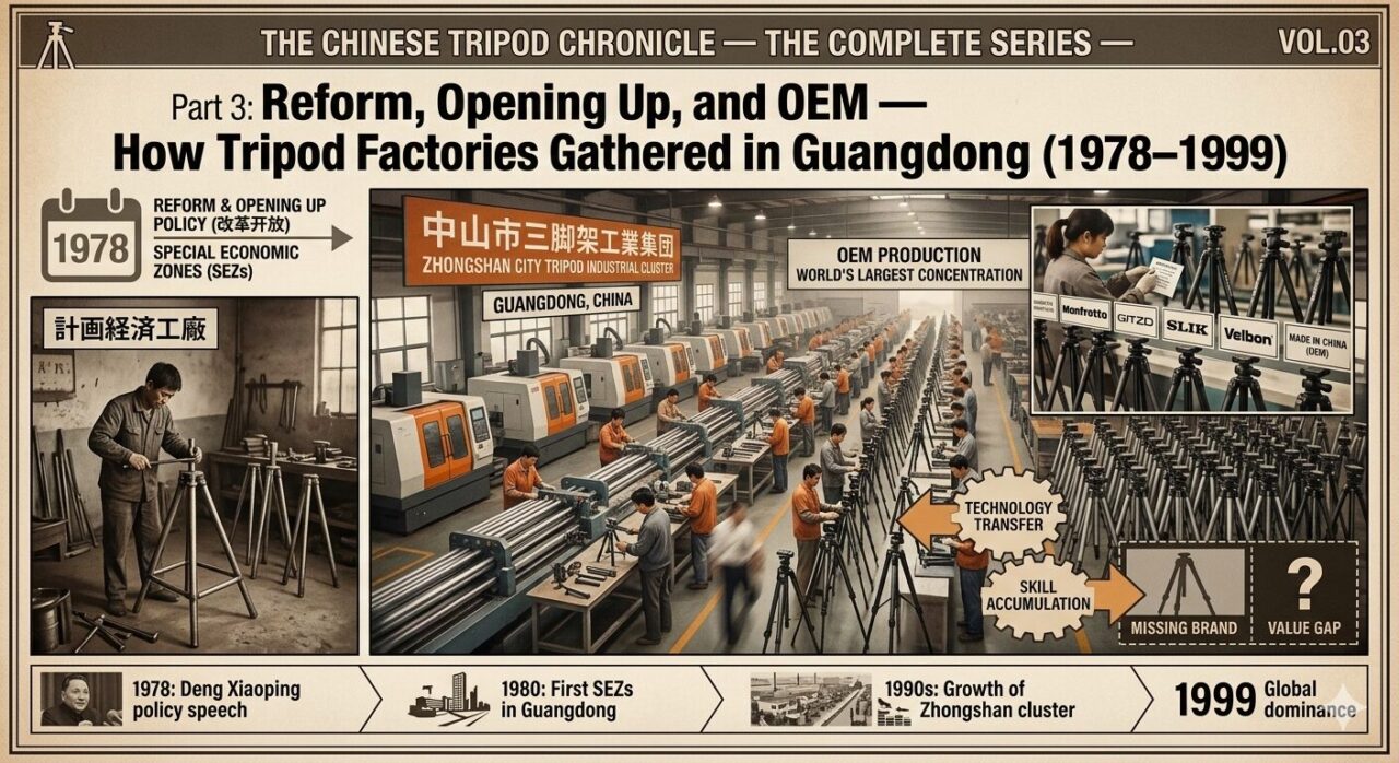 とはいえ、改革開放の初日から中国製三脚が世界に輸出されたわけではない。1978年から1999年までの約20年間は、外資の導入、経済特区の設置、OEM(相手先ブランド製造)受注の開始、そして広東省珠江デルタへの産業集積という、長い「助走」の時代だった。