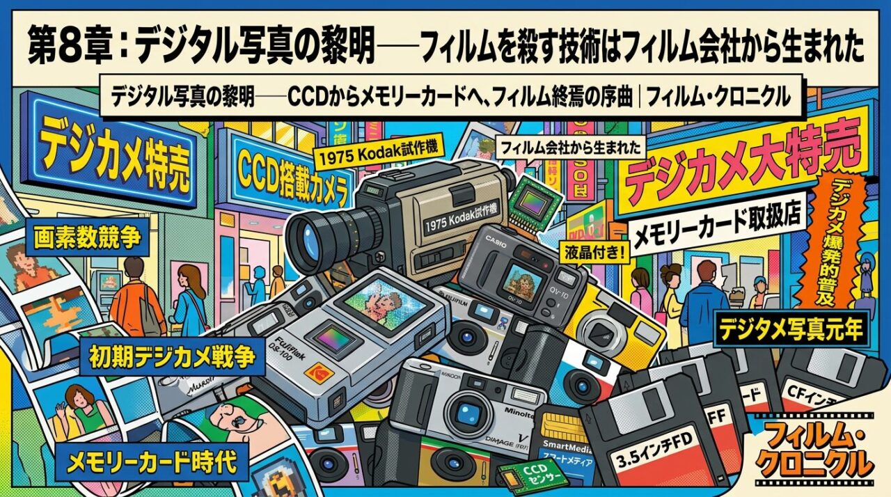 なお、ここでもKodakの名前が登場することに注目してほしい。Kodakは自社ブランドでの民生用デジタルカメラには慎重でありながら、他社へのOEM供給という形でデジタル技術を外部に流出させていた。フィルム事業を守るために自社製品化を遅らせた結果、技術だけが先に広まるという皮肉な構図である。