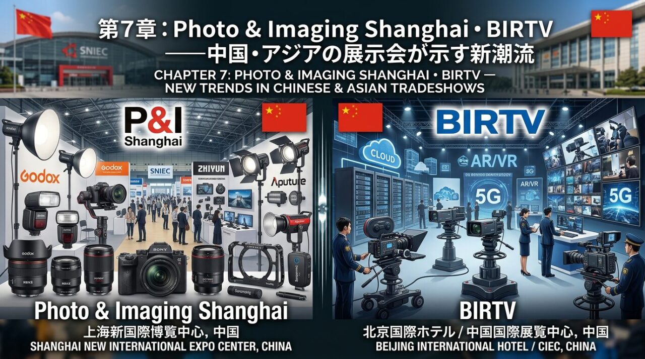 欧米と日本の展示会を概観してきた本連載だが、ここで視線を東に転じなければならない。中国を中心とするアジアの展示会は、いまや世界の写真映像産業の地殻変動を読み解くうえで無視できない存在になっている。本章では Photo & Imaging Shanghai(P&I Shanghai)と BIRTV を中心に、中国・アジアの展示会が示す新たな潮流を分析する。