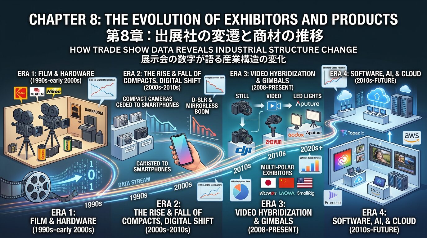 展示会は産業の鏡である。出展社の顔ぶれ、扱う商材のカテゴリー、ブース面積の配分——こうした数字の変化を追うことで、写真映像産業の構造変化を定量的に読み解くことができる。本章では、主要展示会の出展データを横断的に分析し、過去30年間にわたる産業構造の変遷を浮かび上がらせる。