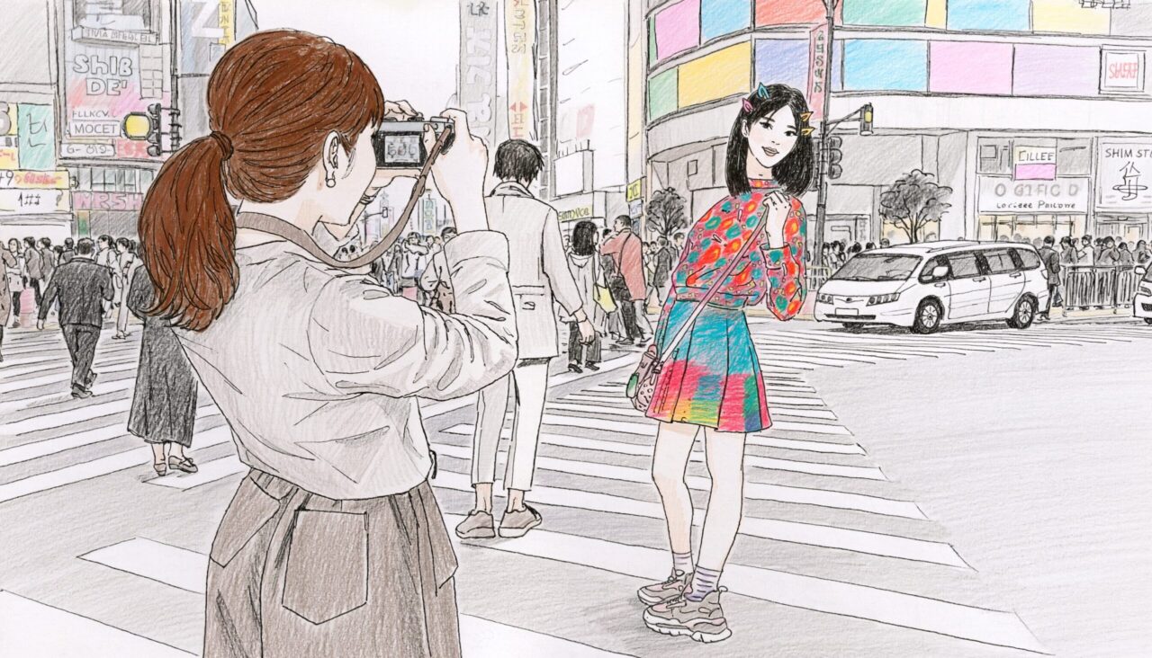 筆者がフルサイズで50mmのレンズを使うときは、被写体の方をいつメンの友人のようなイメージで撮影したいときに使用します。「ほぼ人間の目で見ている感覚に近い画角」に近く、1mくらいの距離だと全身が入りきらないです。ですので、50mmで全身を撮るとき=数m先から友人に声をかけるような感覚で、バストアップを撮影=友人と遊んでいるときの感覚、離れたところから背景の中に被写体を溶け込ませて撮る=街で見かけた友人を見る感覚が近いと思います。
