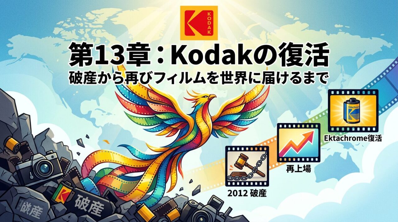 かつて写真フィルムの代名詞だった黄色い箱が、ふたたび店頭に並び始めた。 2012年に連邦破産法第11章の適用を申請し「フィルムの時代は終わった」と世界中で報じられたKodakが、わずか10年余りでフィルム増産と直販体制の構築に踏み切っている。本章では、破産・再編・復活という激動を経たKodakのフィルム事業を、企業分割の構造から2026年の最新動向まで追う。