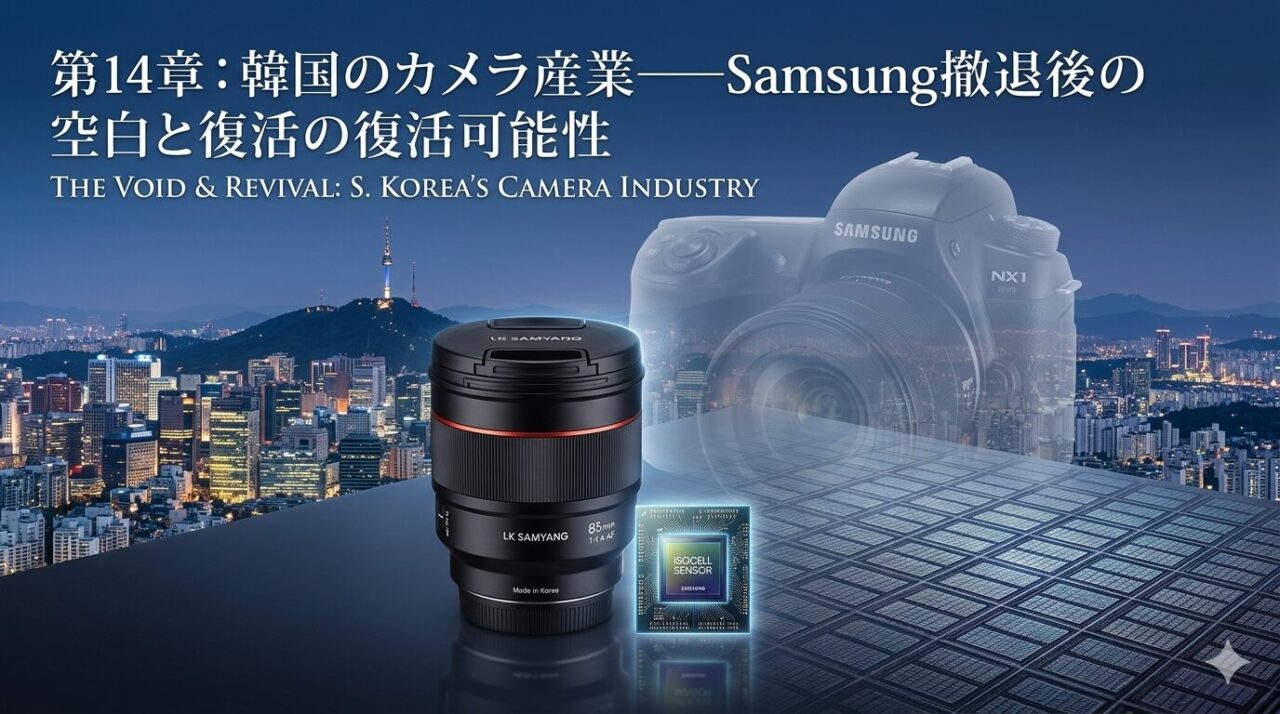 本章では、Samsung NXの教訓を深掘りし、韓国に残る唯一の国際的レンズメーカーであるサムヤン(LK Samyang / Rokinon)の現在を概観する。さらに、SamsungのISOCELLセンサー、OLEDディスプレイ、ファウンドリ事業がカメラ産業のサプライチェーンにどう関わっているのかを分析し、韓国カメラ産業の「空白」と「残照」を描く。