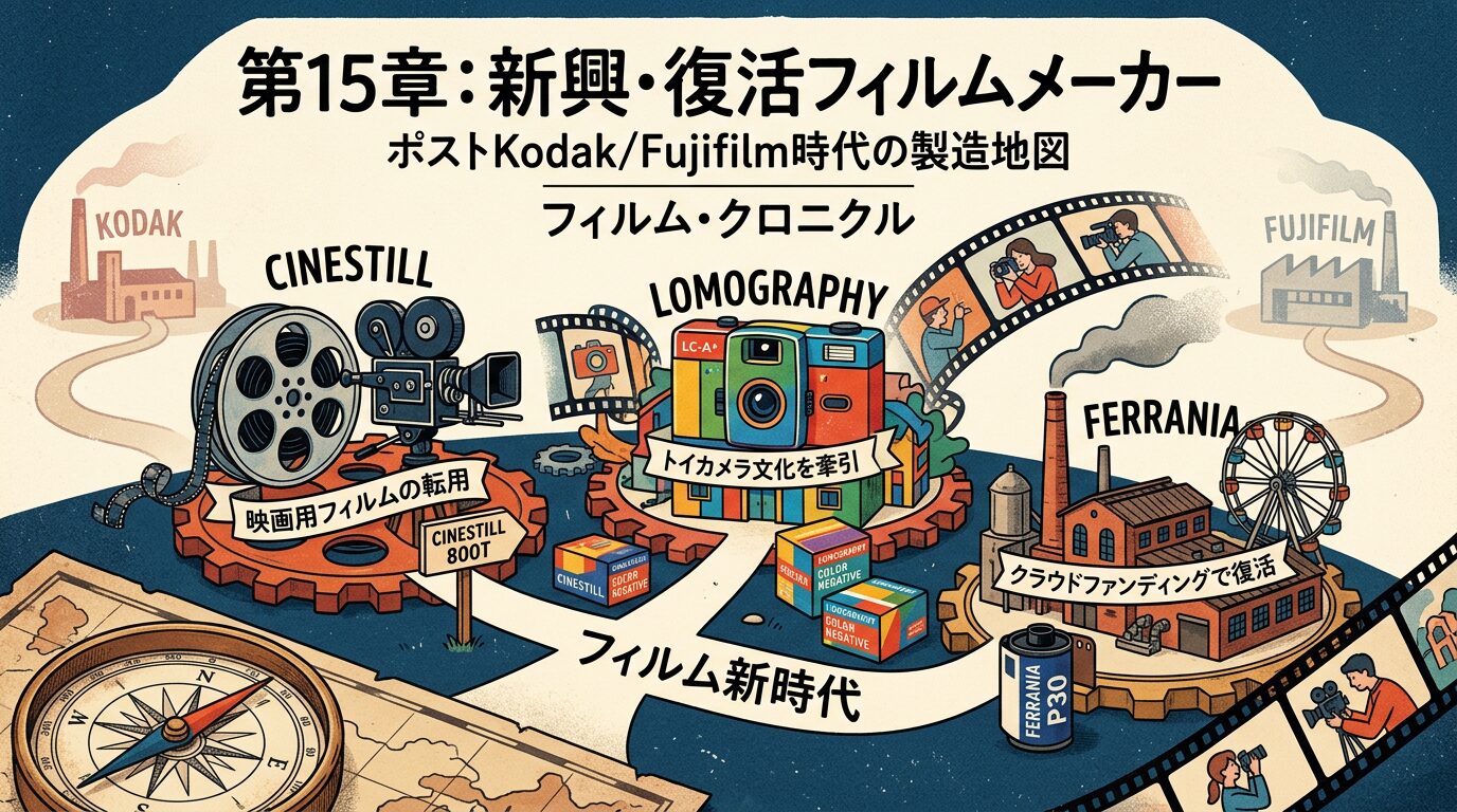 フィルム製造の地図が、21世紀に入って根底から書き換えられている。 20世紀の銀塩写真産業はKodak、Fujifilm、Agfa、Konicaといった巨大メーカーの寡占状態だった。だが2020年代のフィルム製造地図を広げると、そこに並ぶ名前はまるで違う。イタリアの廃工場から蘇ったFILM Ferrania、東ドイツの国策フィルムブランドORWO、破産を経て復活したIlford、映画用フィルムを写真用に「翻訳」するCineStill——。かつての巨人たちが撤退した跡地に、クラウドファンディングと情熱で立ち上がった新興メーカーが次々と旗を立てている。本章では、Kodak・Fujifilm以外のフィルム製造者たちの群像を描く。彼らの挑戦は、フィルム写真がもはや「大企業の事業」ではなく「コミュニティの文化財」へと変質したことを物語っている。
