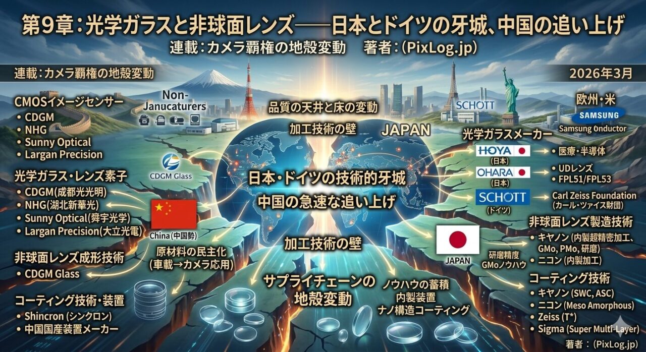 本章では、光学ガラス、非球面レンズの成形技術、そしてコーティング技術という三つの切り口から、カメラレンズの「原材料」サプライチェーンを掘り下げる。ここには、日本メーカーの技術的優位と、その優位が揺らぎ始めている現実が、同時に存在している。