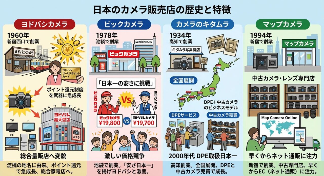 - カメラのキタムラ:1934年に高知で創業した写真機店が母体。全国にフランチャイズ展開し、DPEサービスと中古カメラ売買を組み合わせたビジネスモデルで、2000年代にはDPE取扱店舗数日本一を誇った。
