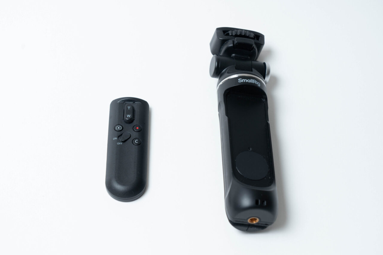 カメラ底面の 1/4インチネジ穴に取り付けるだけで使用できます。持ち手部分には操作系のコントロールモジュールが搭載されており、これがマグネット式で脱着可能になっている点が最大の特徴です。グリップとして使うときはコントローラーをグリップに装着し、三脚モードではコントローラーを取り外してリモートで操作する、という切り替えが直感的にできます。