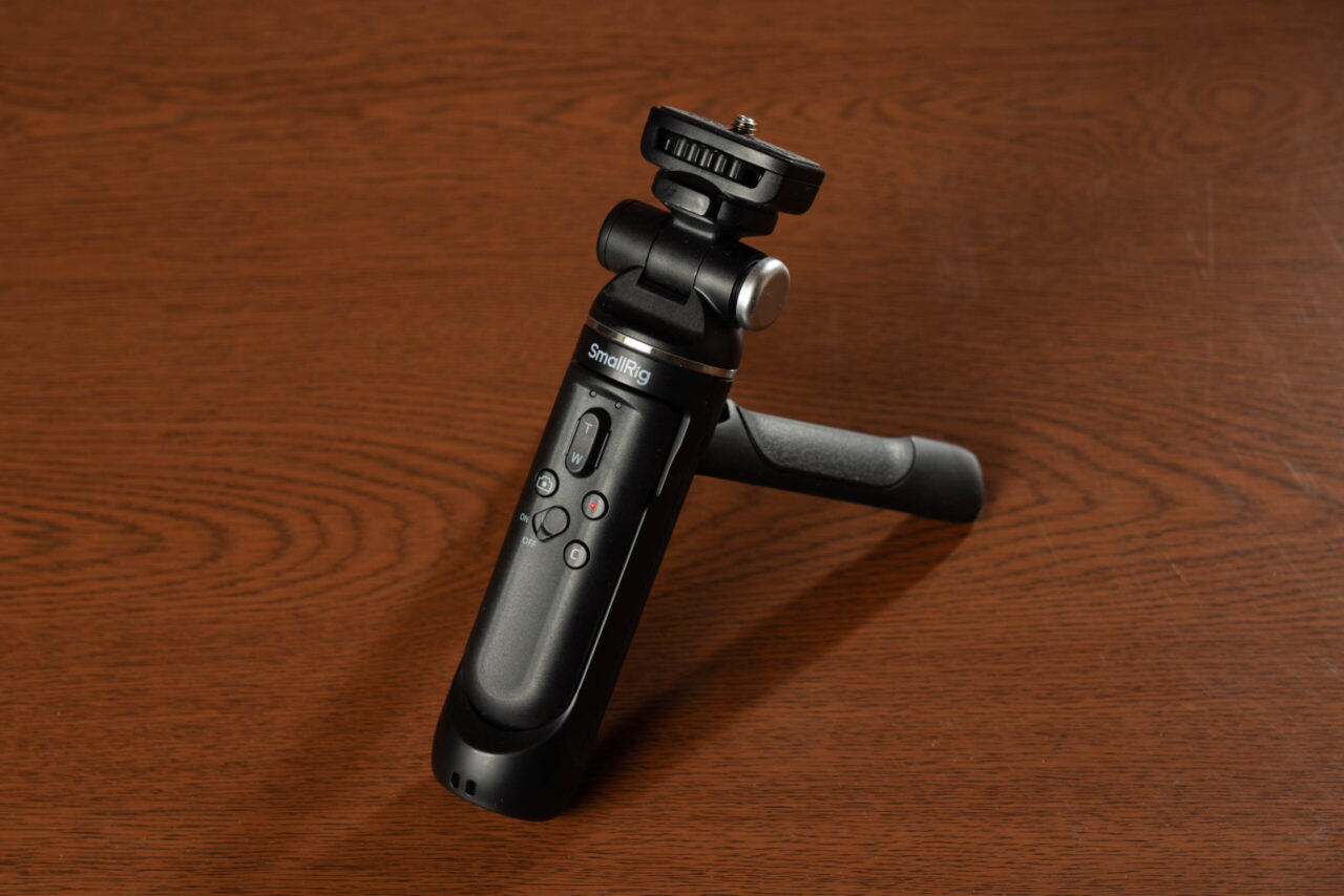 卓上三脚モードは、グリップ底部にある 2 本の小さな脚を展開することで成立します。テーブルの上や床に置いてのライブ配信、Vlog 撮影、ブツ撮りには十分な安定感があります。