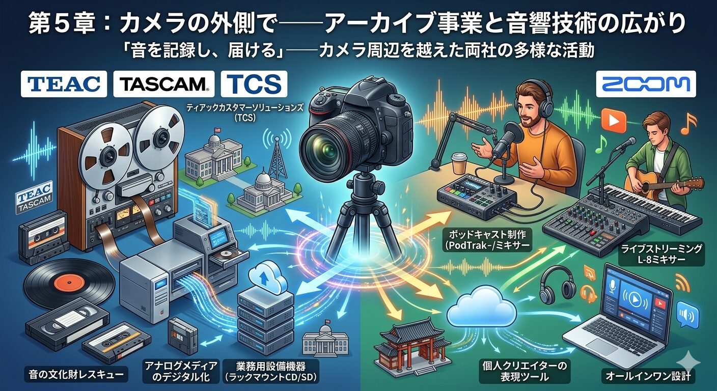ティアックとZOOM——両社の技術が活きるフィールドは、カメラの周辺だけではない。 ここまでの章ではビデオグラファーとの接点を中心に語ってきたが、両社にはカメラとは直接関係のない、しかし「音を記録し、届ける」という根幹に深く結びついた事業領域がある。本章では、ティアックの子会社であるティアックカスタマーソリューションズ(TCS)のアーカイブ事業と、ZOOMがポッドキャスト・ライブ配信市場に向けて展開する製品群を取り上げ、両社の技術がカメラの外側でどのように社会に貢献しているかを掘り下げる。