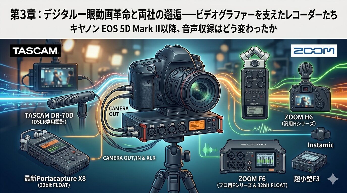 この革命が、音響機器メーカーであるティアック(TASCAM)とZOOMに、思わぬ特需をもたらした。なぜなら、DSLR動画には決定的な弱点があったからだ——音声収録能力の貧弱さである。
