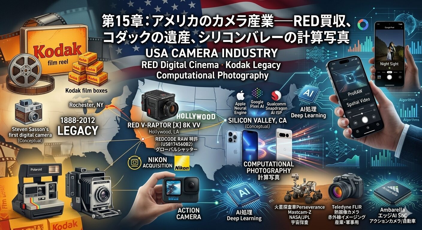 アメリカは「カメラを作らない国」になったのではない。カメラの定義そのものを書き換える国になったのだ。本章では、REDのニコンによる買収、Kodakが残した技術的遺産、GoProの栄光と苦境、そしてシリコンバレーの計算写真技術がカメラ産業に与える影響を、多角的に分析する。